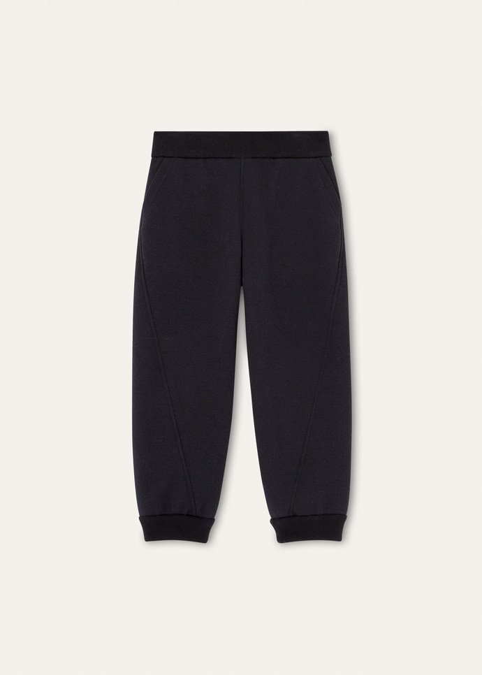 Softly structured, these Viera pants bring playful ease for little ones. They are crafted from sumptuous Luxury Fleece, a double jersey with cotton and cashmere on the outside, and pure silk lining the inside. The ribbed waistband and cuffs in matching yarn lend a cozy finish, perfect for movement and quiet moments alike.