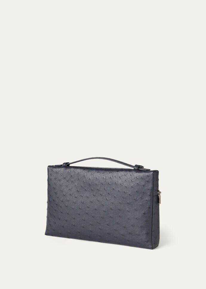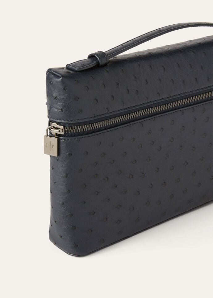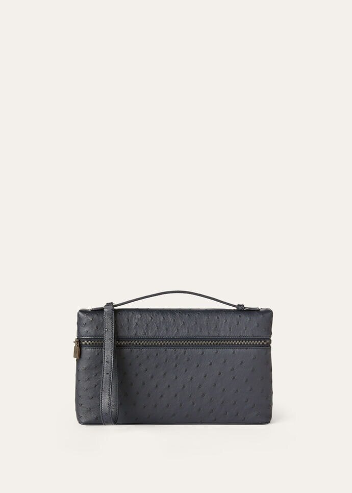 Inspired by the iconic Extra Pouch and meticulously crafted from prized ostrich leather, this new piece is our latest creation. A highly functional and versatile bag with a detachable leather wrist strap, the meticulously detailed zip pull features the Loro Piana logo in a tonal shade, adding a touch of sophistication to the impeccable design. From the fine texture of the leather to the finishing touches, every detail has been considered to create an exclusive, delightful accessory.