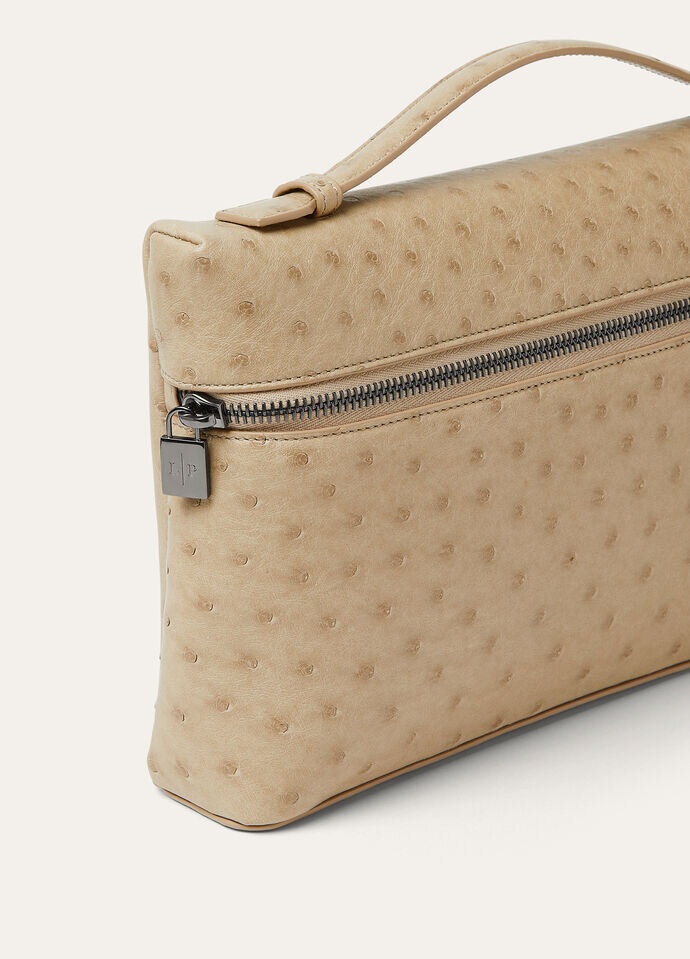 Inspired by the iconic Extra Pouch and meticulously crafted from prized ostrich leather, this new piece is our latest creation. A highly functional and versatile bag with a detachable leather wrist strap, the meticulously detailed zip pull features the Loro Piana logo in a tonal shade, adding a touch of sophistication to the impeccable design. From the fine texture of the leather to the finishing touches, every detail has been considered to create an exclusive, delightful accessory.