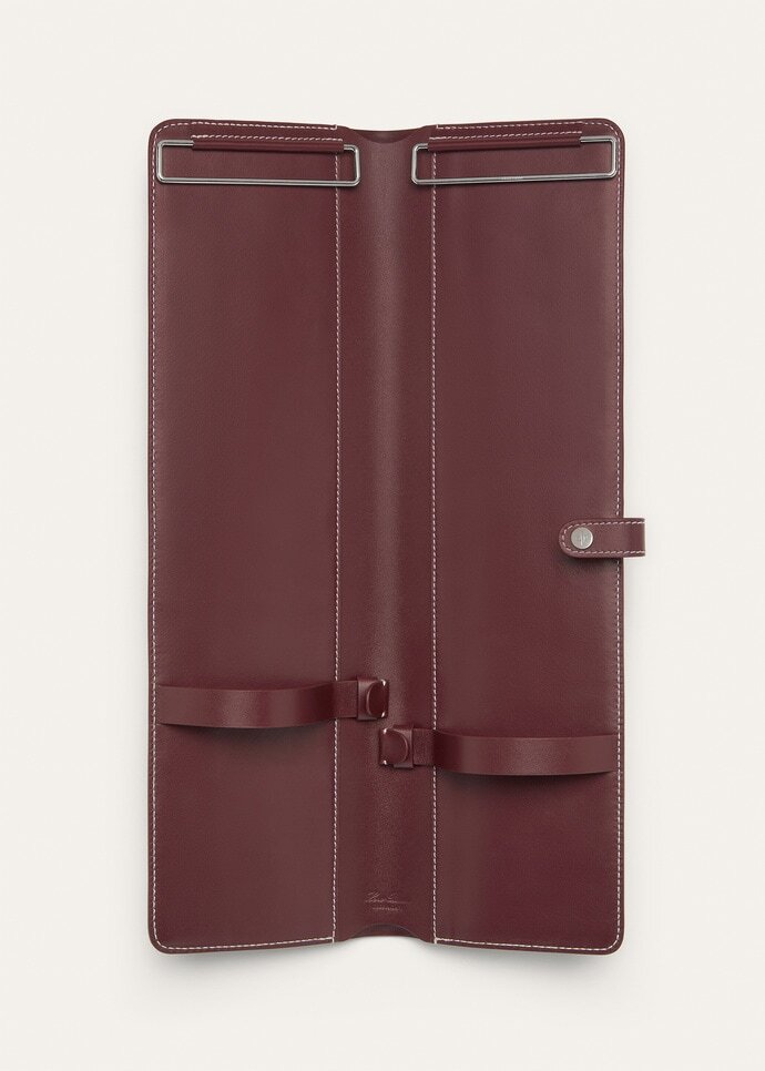 A practical accessory for the modern traveler, the refined Guardaroba holder keeps ties neatly organized and fresh. It is rendered in supple Saddle Leather, finished with intricate topstitching, and accented with a hot-stamped logo on the outer. Classic and versatile, it accommodates one tie on either side, which are looped around the metal rings at the top and held in place with the leather tab at the base.