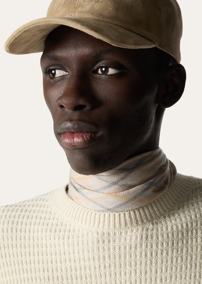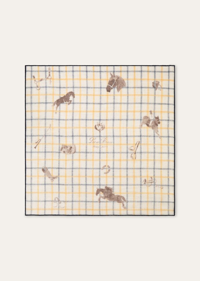Chevron-woven in a lightweight cashmere and silk blend, the Horsey foulard pays tribute to the Maison’s equestrian roots. Watercolor horses and riding gear animate the classic check backdrop in hints of yellow and blue. At the center, the Loro Piana logo emerges as a discreet signature, framed by Roman numerals that mark the piece’s year of creation for a distinctive collector’s touch.