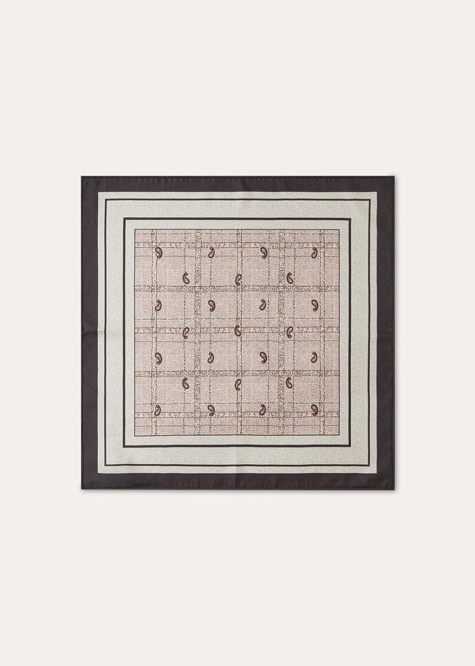 The Boteh pocket square reflects Loro Piana’s rich heritage, beautifully complementing any ensemble with understated finesse. A true masterpiece of design and craftsmanship, this sophisticated piece in elegant silk has a check base decorated with an all-over paisley design. This intricate pattern is created using a complex screen-printing technique and framed by bold concentric squares. The soft, supple texture of the silk and the rich, vibrant colors of the paisley motif combine to create an enchanting piece.