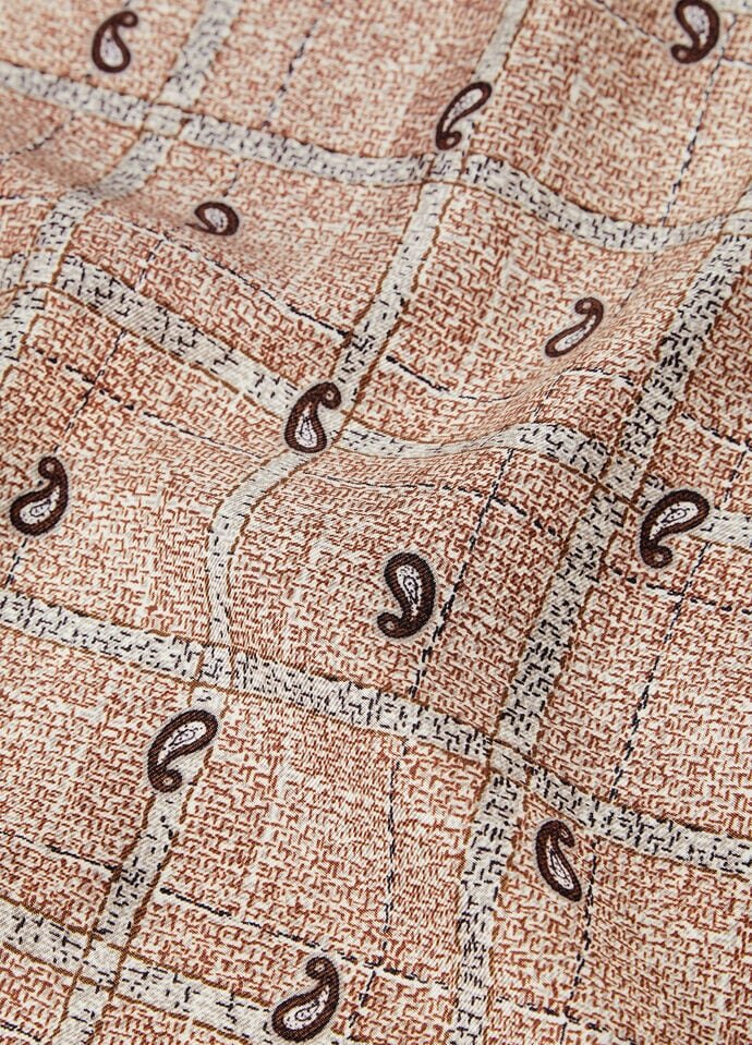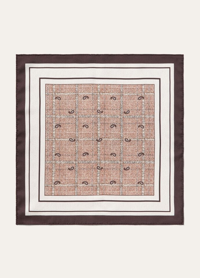 The Boteh pocket square reflects Loro Piana’s rich heritage, beautifully complementing any ensemble with understated finesse. A true masterpiece of design and craftsmanship, this sophisticated piece in elegant silk has a check base decorated with an all-over paisley design. This intricate pattern is created using a complex screen-printing technique and framed by bold concentric squares. The soft, supple texture of the silk and the rich, vibrant colors of the paisley motif combine to create an enchanting piece.