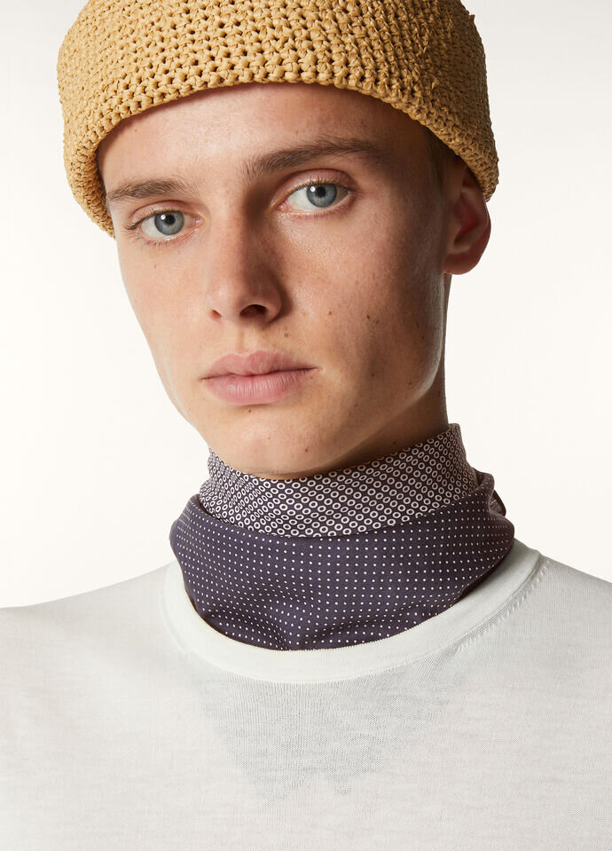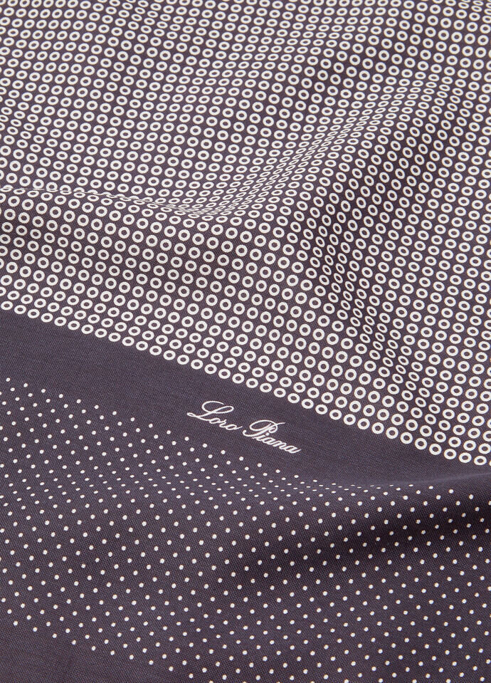 Characterful and versatile, the Pois & Dots foulard is a sophisticated accessory that combines subtlety with charm. Woven from a blend of cotton and silk and finished with a complex screen-printing technique, it is embellished with a micro circle pattern, framed with a polka-dot border. The Maison’s logo is seamlessly integrated into the layout, adding a signature touch.