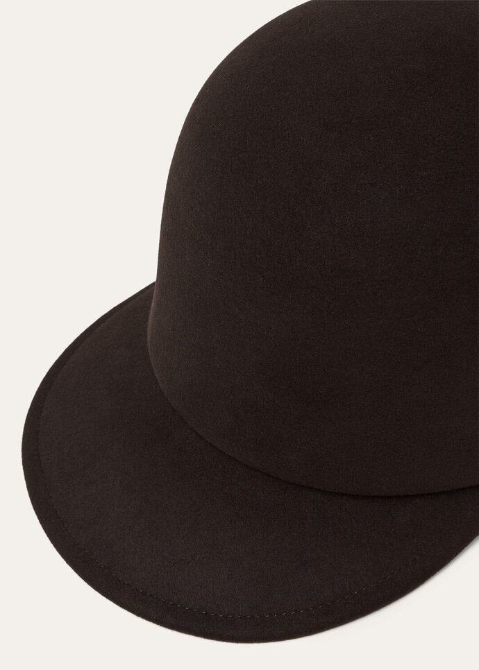 Equestrian inflections lend the Alma hat from the Loro Highlands Capsule collection its distinctive character. Shaped with a rounded crown and a softly curved peak, it is edged in precise stitching to evoke the classic riding cap. It is crafted from My Felt – a naturally lustrous, velvety rabbit fur felt – and imbued with water-resistant properties. An inner band in Kummel-colored grosgrain lends subtle contrast and a signature touch.