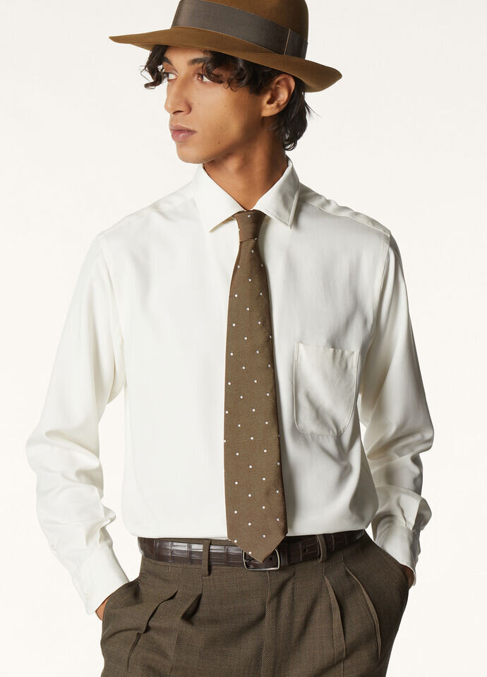 In the grand tapestry of the collection, accessories are the golden threads that weave together past and present, each subtly symbolizing the brand’s century-long commitment to uncompromising elegance. The classic printed pure silk tie with its playful yet sophisticated polka dot pattern is made from a luxurious fabric that falls beautifully. The ideal addition to any smart ensemble.