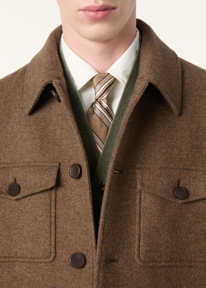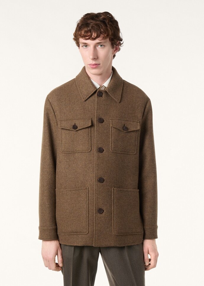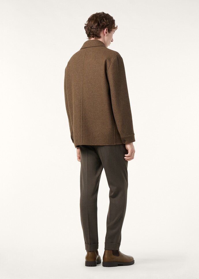 Crafted from a double-layered blend of Wish® wool and cashmere, the Devis Caban is the epitome of warmth and style. It is woven with a subtle herringbone motif, enriched through fulling and brushing to evoke the soft density of Melton felt. The caban silhouette is finished with leather-trimmed interior pockets for a discreet note of sophistication.