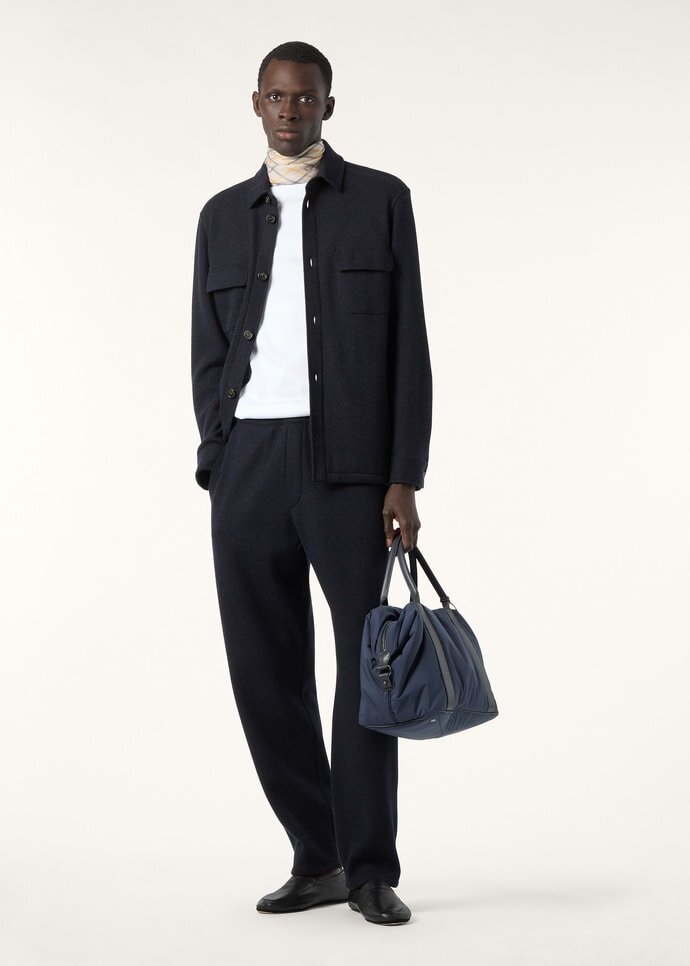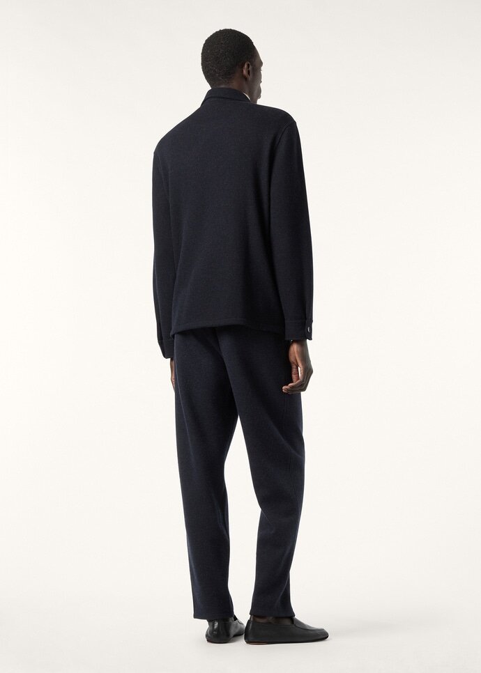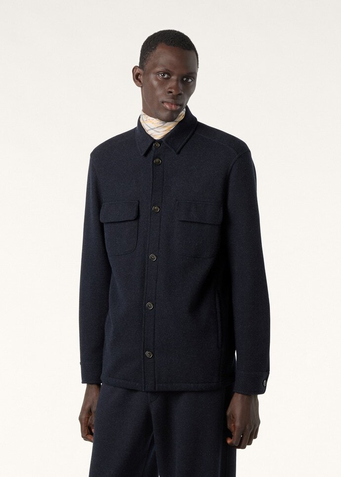 Shirt/jacket in two-tone double cashmere Jersey Novalis, our iconic lightweight yet warm naturally stretchy fabric that gently envelops the wearer. Details include a shirt-style collar and visible button fastening.