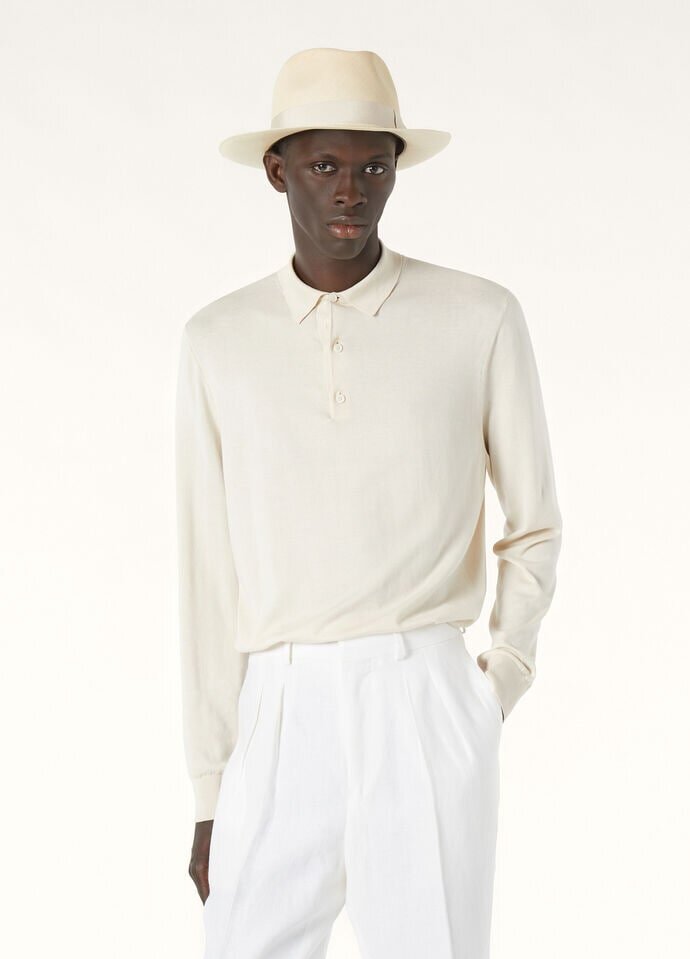 A sophisticated summer garment, this polo shirt is crafted in Ice Wish™ using extra-fine Sea Island cotton for a smooth, refreshing hand and elegant finesse. In a classic regular fit, it is traced with rib-knit detailing at the hem, cuffs, and neckline, and finished with a placket featuring subtly shimmering mother-of-pearl buttons.