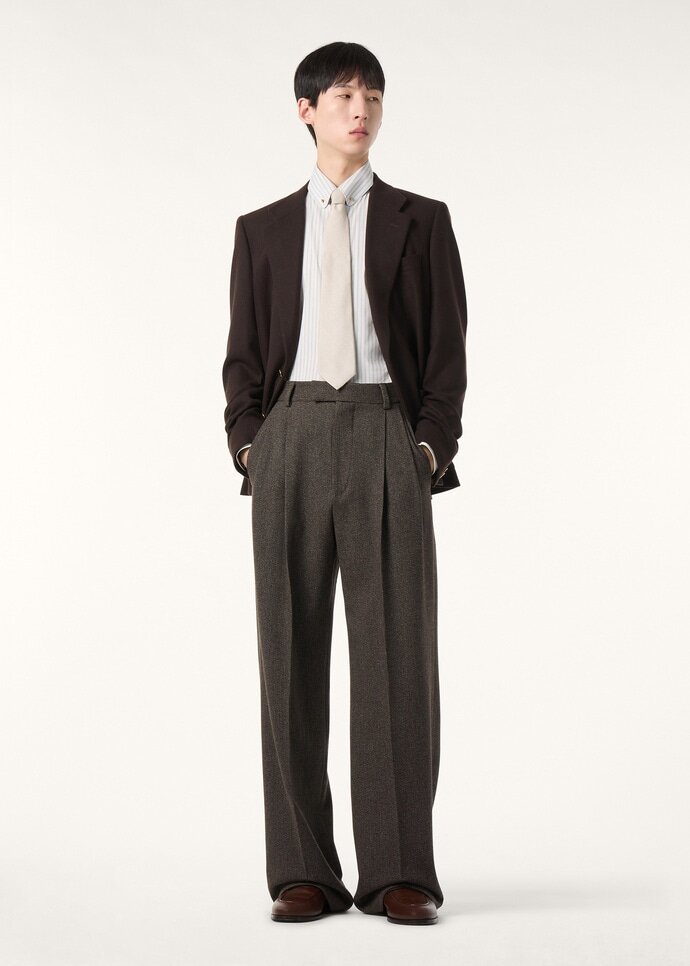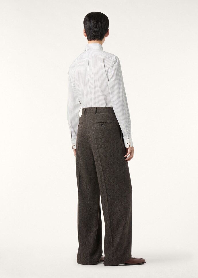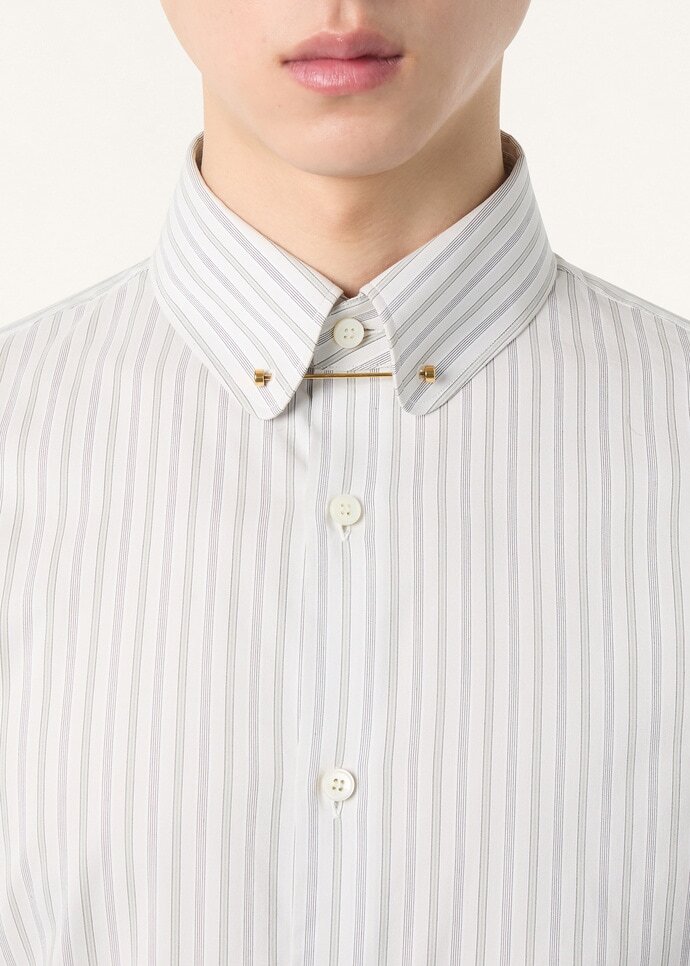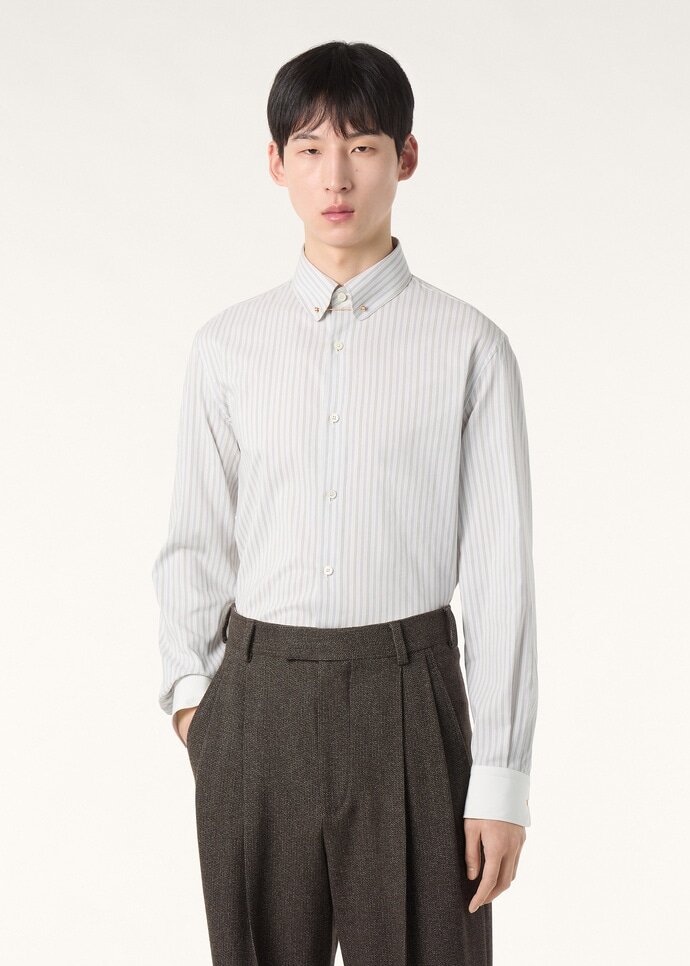 The timelessness of the Elia shirt lies in its fusion of time-honored tailoring and contemporary ease. Classically cut, it is framed with a rounded collar delicately embroidered with eyelets to accommodate a pin. It is cut from cotton and silk cloth with a micro stripe pattern, lending interest to its smooth, fluid surface.