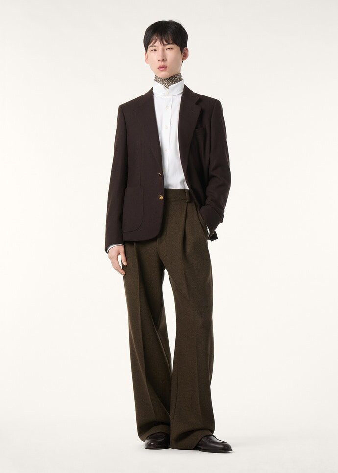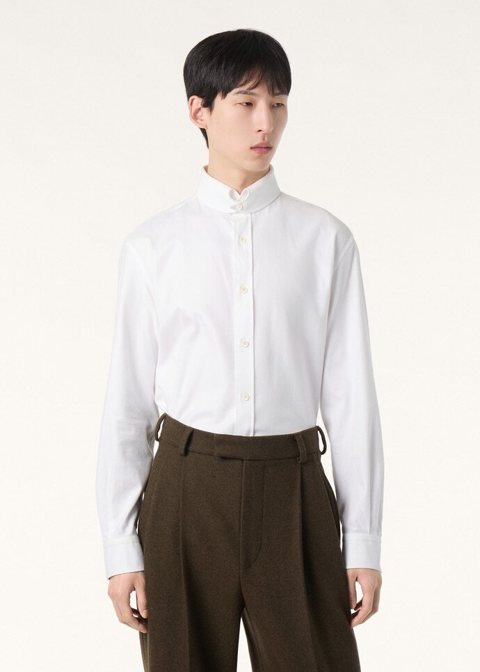 Refined and versatile, the Elia shirt combines the classic fit of the André shirt with collar tips, held in place with discreet buttons. It is woven from Ginestra shirting cloth, a classic Loro Piana flannel fabric made from cotton.