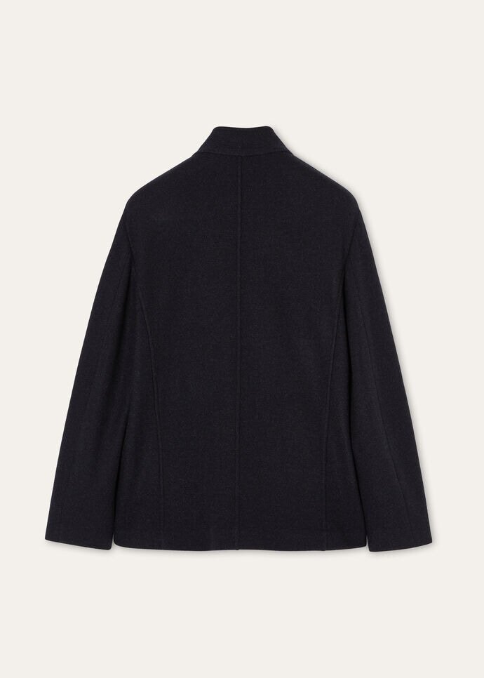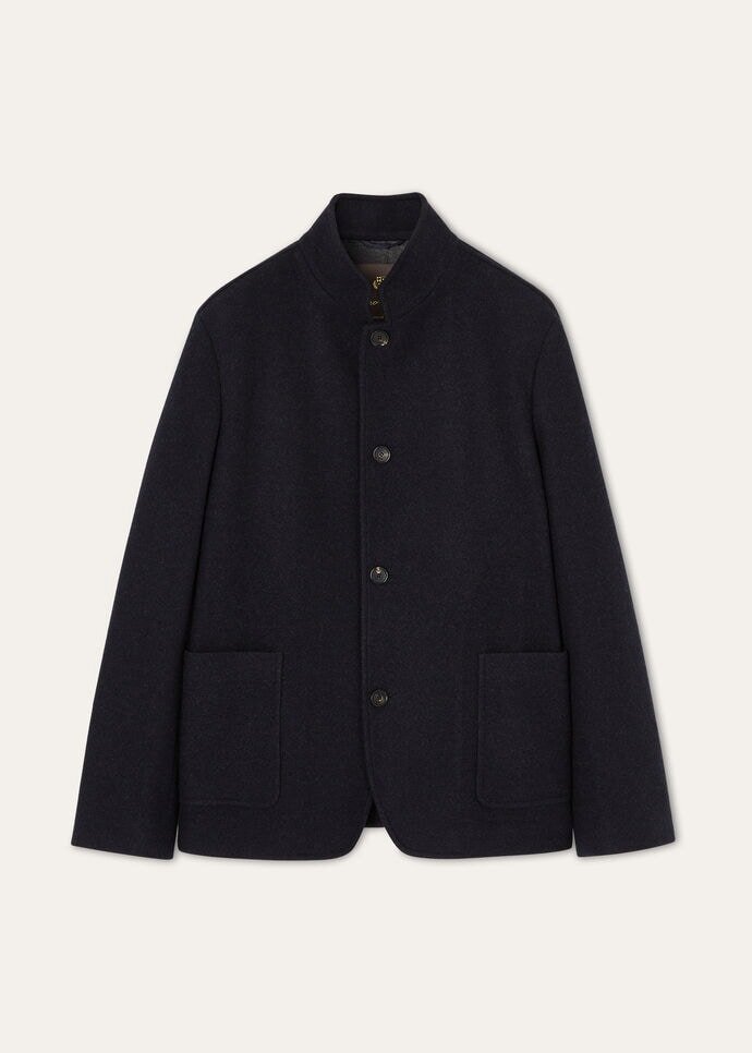 Upright banded collarHorn buttons and suede top buttonholeLarge patch pockets with calfskin under-flapsRounded at the hem on the frontStory telling label insideComposition: 96% Cashmere, 4% Technical Fabric