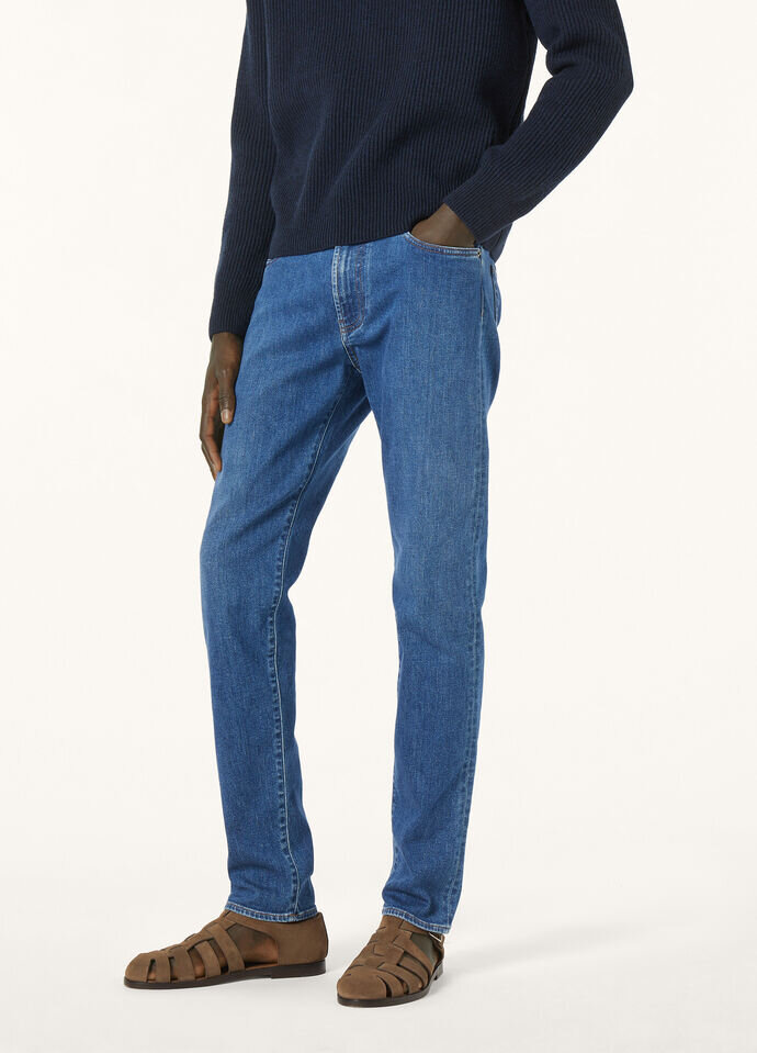 Loro Piana pants are an embodiment of sartorial refinement, telling a story of heritage and innovation through their impeccable fit and luxurious materials. Luxuriously soft yet compact, these slim-fit Japanese denim pants skim your legs with the highest quality, every stitch a testament to expert craftsmanship. The classic five-pocket design offers timeless versatility, perfect for dressing up with a crisp shirt or dressing down with a simple T-shirt.