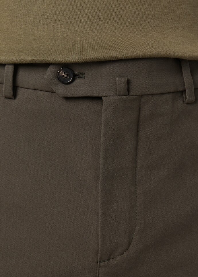 Ultra-soft cotton pants with a touch of stretch. Flat fronted and garment dyed, for an impeccable finished look. Team this versatile casual staple with a jacket or outerwear for contemporary outfits with effortless polish.