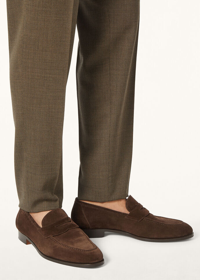 Fusing style with heritage, the iconic Sergio loafers are inspired by Sergio Loro Piana’s personal collection. They are crafted using the closed-channel Blake method—named after the sewing machine—whereby the sole, lining, upper, and insole are joined with a single seam, for a flexible and durable finish. The vamp is worked using Adler workmanship, a double-stitch technique which creates an elegant relief effect. Classic and characterful, the moccasin profile is finished with a distinct band, which is reminiscent of 1970s looks that were dear to Sergio.