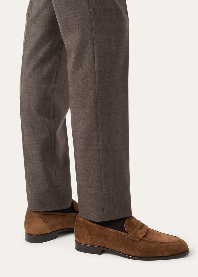 Fusing style with heritage, the iconic Sergio loafers are inspired by Sergio Loro Piana’s personal collection. They are crafted using the closed-channel Blake method—named after the sewing machine—whereby the sole, lining, upper, and insole are joined with a single seam, for a flexible and durable finish. The vamp is worked using Adler workmanship, a double-stitch technique which creates an elegant relief effect. Classic and characterful, the moccasin profile is finished with a distinct band, which is reminiscent of 1970s looks that were dear to Sergio.