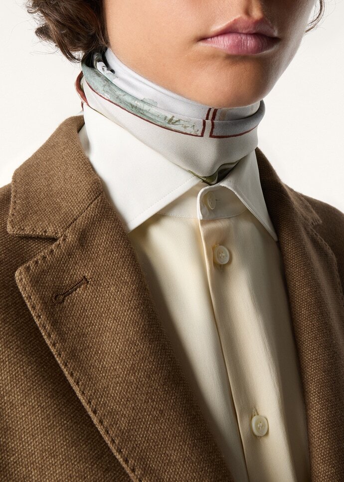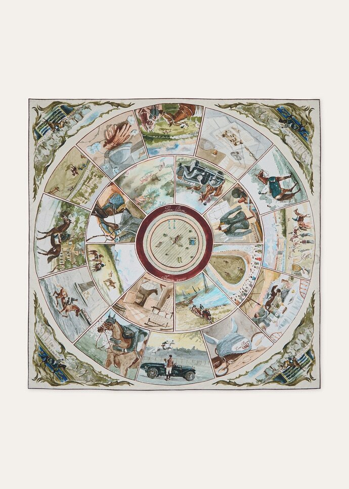 In elegant silk twill, the Arena foulard is decked with a hand-illustrated water-color motif honoring Loro Piana’s fascination with the equestrian world. Horse-riding scenes play with vintage cars and sartorial details – all converging at the arena, the heart of the composition. A contrasting border, echoing the palette within, finishes the design with graphic precision.