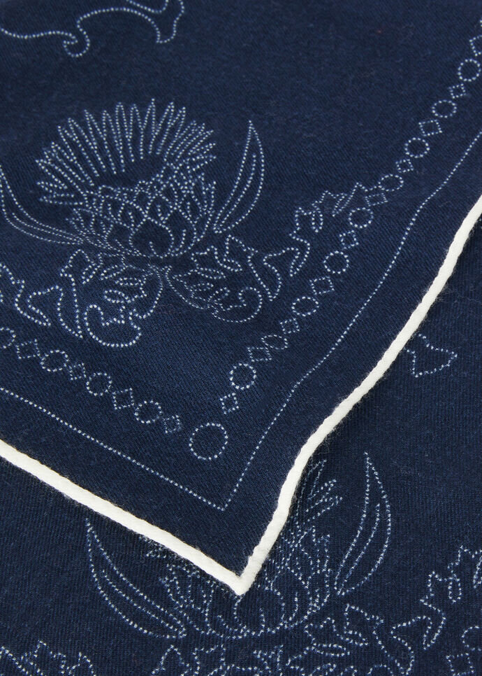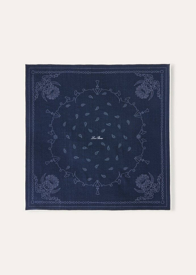 The Cardo foulard is a delicate whisper of elegance, an exquisite flourish of texture that transforms fashion into poetry. An ornamental pattern of thistles in each corner adorns this foulard, exquisitely crafted in soft, lightweight wool and bordered with an intricate paisley motif framing the Loro Piana logo – the focal point of this sophisticated accessory. Tie it at the neck or drape it over the shoulders for a sophisticated finish.