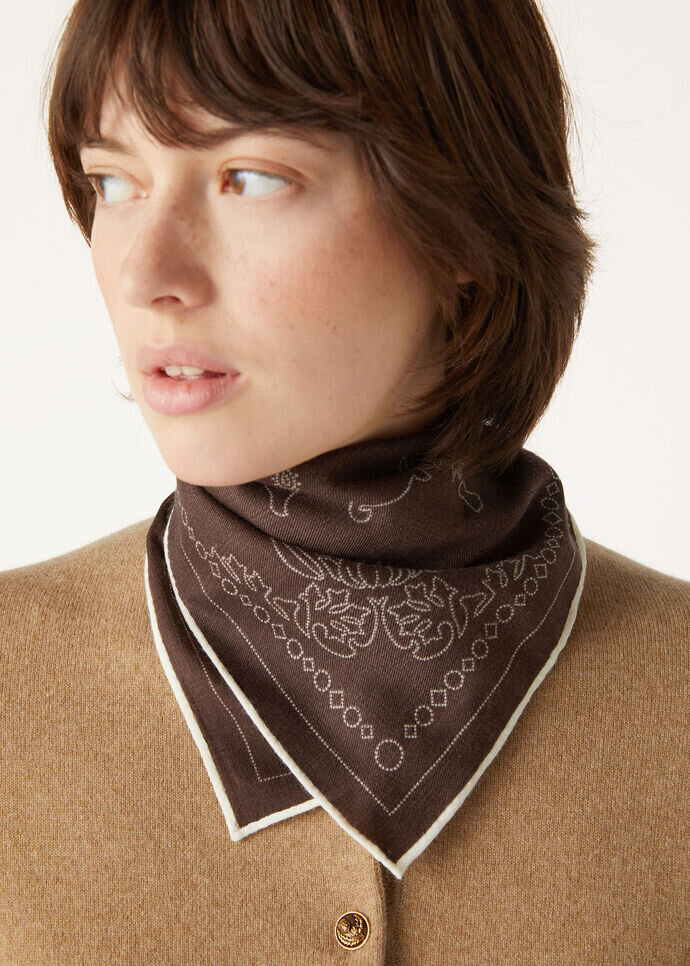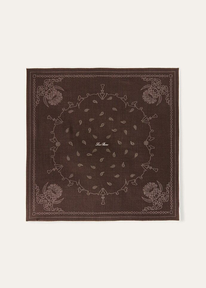 The Cardo foulard is a delicate whisper of elegance, an exquisite flourish of texture that transforms fashion into poetry. An ornamental pattern of thistles in each corner adorns this foulard, exquisitely crafted in soft, lightweight wool and bordered with an intricate paisley motif framing the Loro Piana logo – the focal point of this sophisticated accessory. Tie it at the neck or drape it over the shoulders for a sophisticated finish.