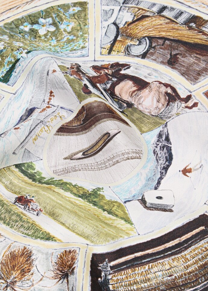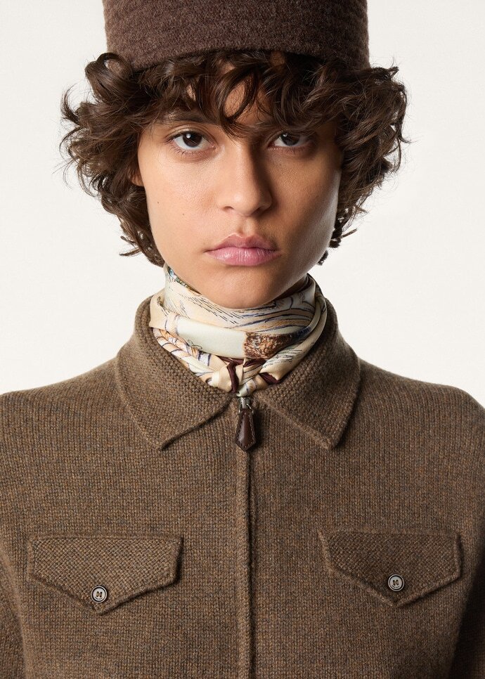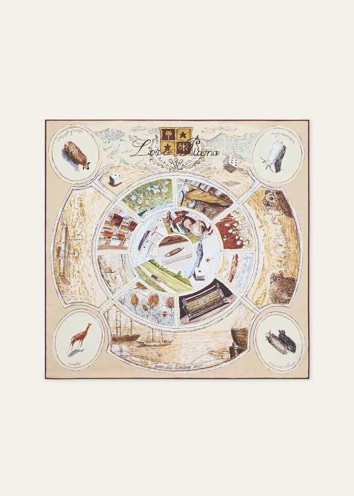 Crafted from pure silk, the Gioco delle Eccellenze foulard is printed on both sides with hand-painted artwork inspired by a traditional board game. The design animates a playful journey through the Maison’s emblematic worlds—from flax meadows and alpine slopes to sailing boats and artisan looms. Finished with hand-stitched rolled hems and printed on both sides, it includes the name and date of the design in elegant Roman numerals, lending it the character of a collector’s piece.