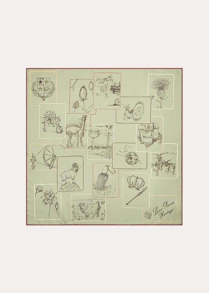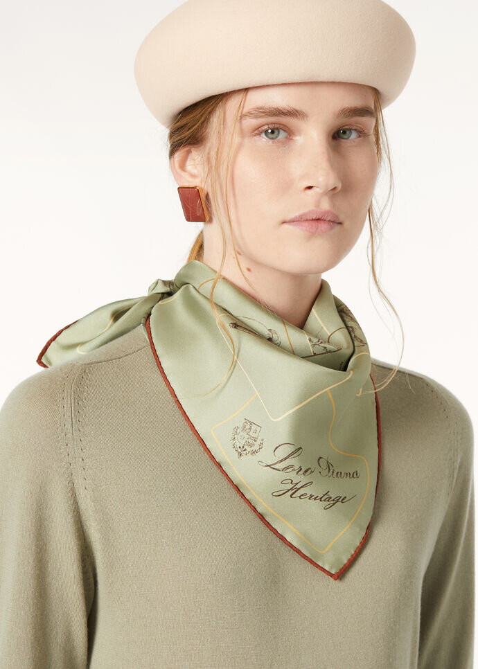 Crafted in smooth silk, the Heritage foulard is emblazoned with a print that has been specially designed to celebrate the Maison’s century-long legacy. Like an archive in foulard form, it visualizes signature emblems from Loro Piana’s history, spanning the origins of its precious animals, artisanal craft techniques, and more, allowing glimpses into an incredible story of craft and excellence.