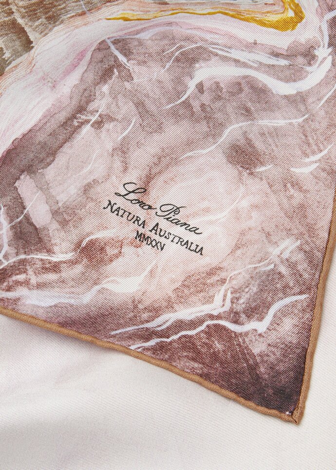 Imbued with chromatic nuance, the Natura Australia foulard is crafted from pure silk twill and illustrated with shifting forms of the Australian landscape. A watercolor palette echoes abstract rock formations that soften into fluid brushstrokes, while earthy neutrals meet vivid pinks, greens, and blues in a harmonious composition. Subtly woven through the scene, the slender silhouettes of vicuñas discreetly nod to the Maison’s heritage.