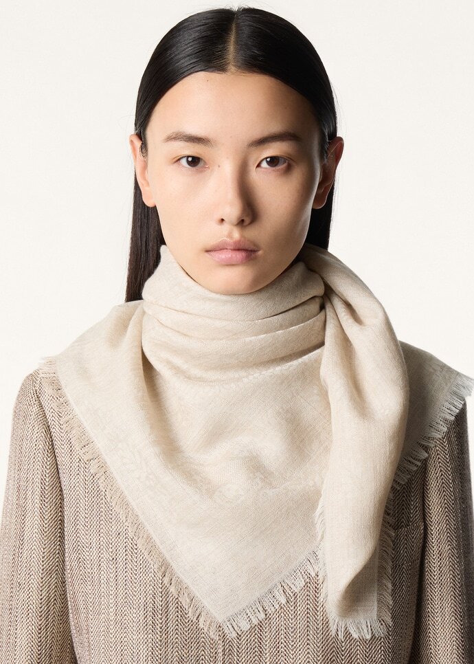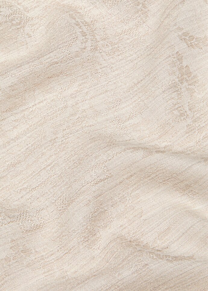 The elegance of Indian tapestry lends a sense of timeless beauty to the Punjab foulard, where paisleys and blooms emerge from the center in balanced symmetry. Screen-printed with fine precision, the design reveals layered details and subtle linework that evoke the character of hand-drawn textile art. The accessory is jacquard-woven from a featherlight blend of cashmere and silk – an elevated canvas for the refined complexity of the motif.