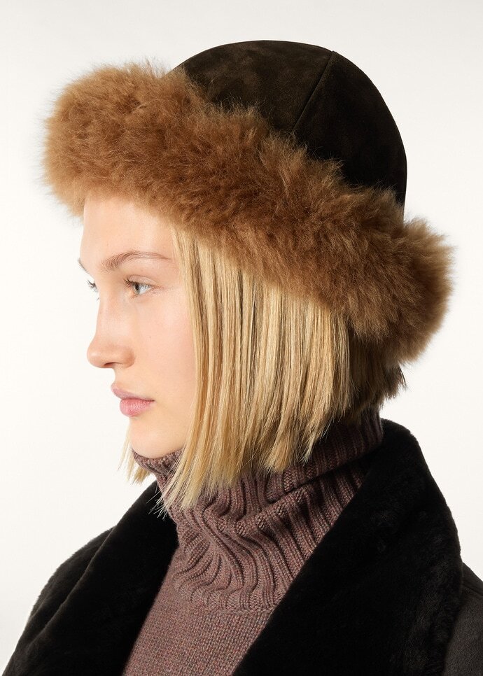 Structured yet infinitely soft, the Kyle hat is crafted from cash suede leather and constructed in six precise panels. Its gently pointed crown is encircled by a wide trim in airy baby alpaca on the base, lending a sumptuous tactile contrast. Lined in quilted silk twill and lightly padded, it cocoons the head in enveloping warmth and refinement.