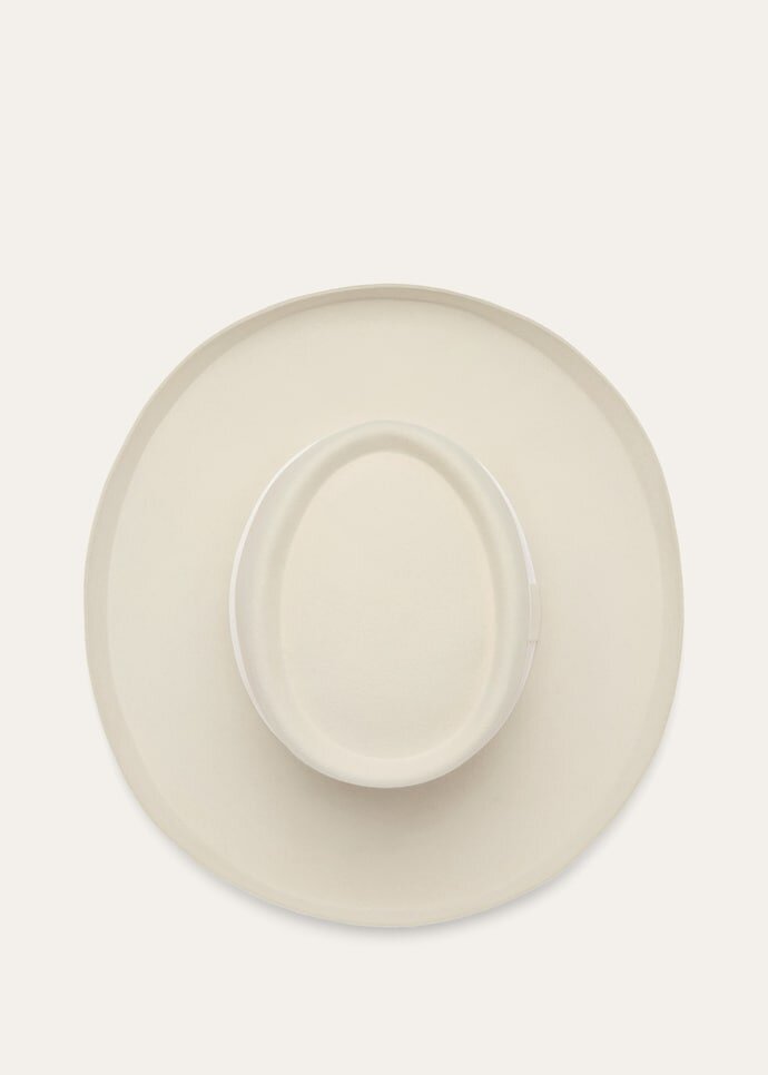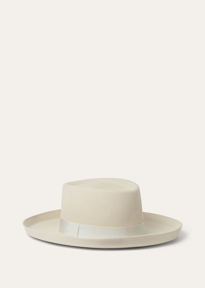 Like the final brush strokes on a masterpiece, the Ofelia hat can lift an ensemble to new heights of sophistication. It features an iconic felt construction, enriched with a touch of sublime baby cashmere for an exquisitely soft feel. The crown eschews traditional divoting for a smooth profile, while the gently curved brim lends an air of refined insouciance.