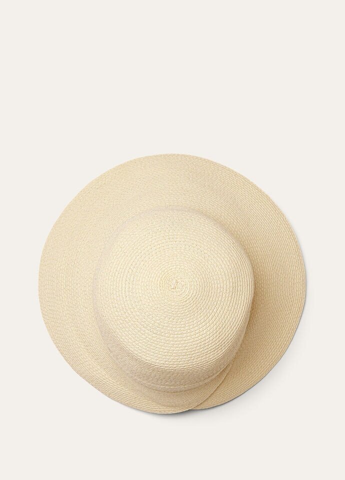 The Veronica hat reimagines the bucket silhouette with sculptural elegance. Finely woven textile paper, shaped through spiral-sewn bands, evokes the texture of classic straw weaves with a refined finish. An asymmetrical brim, designed with overlapping sides, allows for versatile styling, with one flap gently turned upward for a distinctive touch.