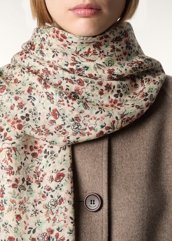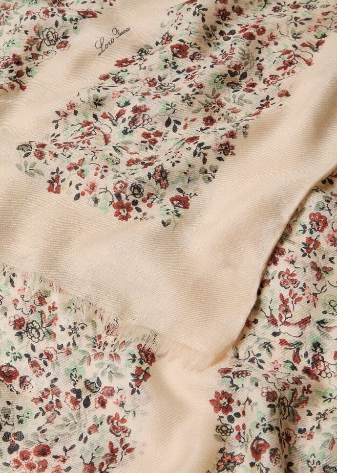 Spun from a near-weightless blend of cashmere and silk, this stole carries an ethereal, sensorial lightness. The Arundel Gardens print, inspired by the charm of English landscaped gardens, reveals a duality of tones: warm and luminous on the front, cooler and composed on the reverse, with jacquard flowers echoing the motif. The piece is gracefully signed off with delicate fringing along the short sides.
