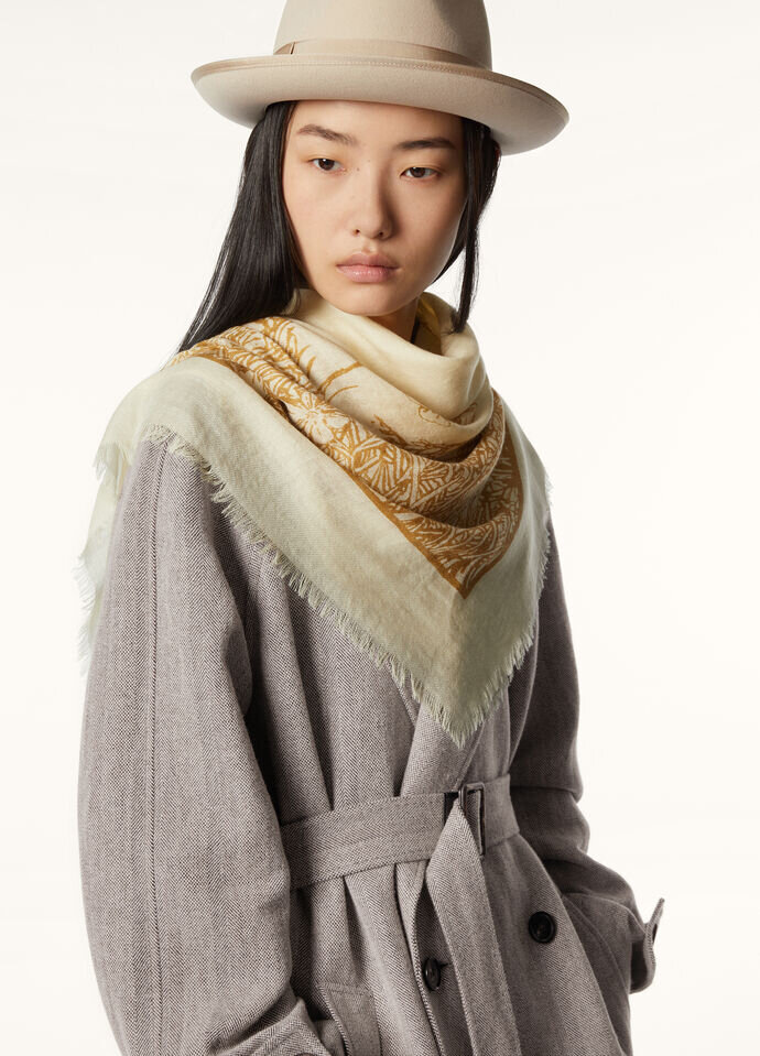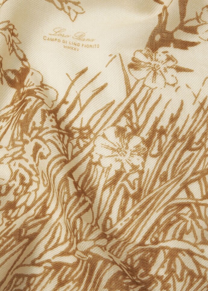 The Campo di Lino Fiorito shawl reflects the Maison’s rich heritage, beautifully complementing any ensemble with understated finesse. Crafted from refined and lightweight cashmere silk, it’s adorned with an enchanting floral motif that captures the enchanting magic of a sunrise and an invigorating summer breeze, depicting a joyful dance of stems and leaves in sinuous motion. The delicate petals, punctuated by clean and intricate lines, merge into an exquisite contrast of shades.