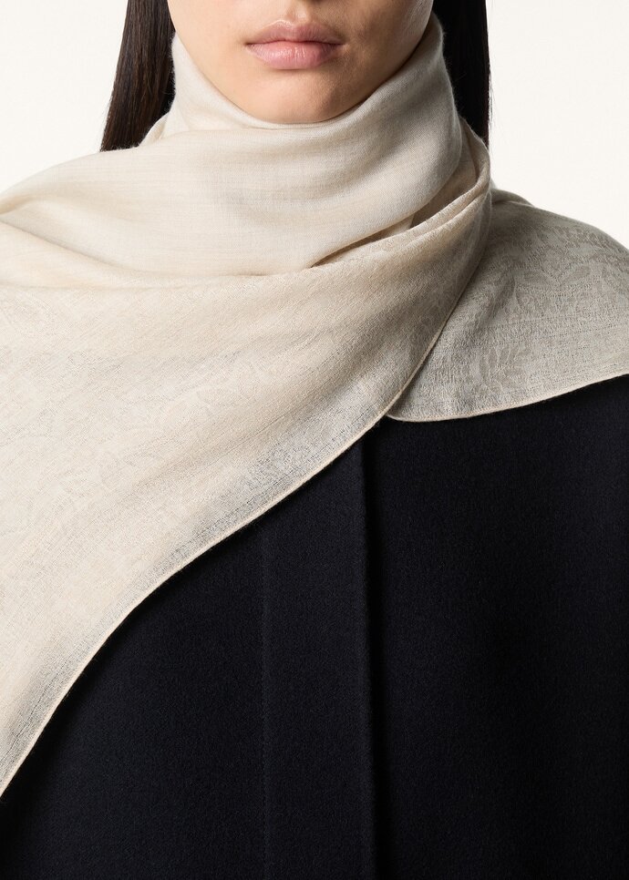 Balancing versatility with sophisticated style, the Punjab stole is an ode to the ancient art of Indian tapestry. In a gossamer and near-translucent blend of cashmere and silk, it is decked with the Loro Piana Punjab motif, screen-printed with paisleys and intricate florals in a kaleidoscope of color and pattern.