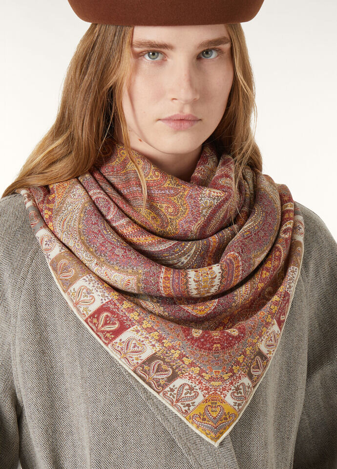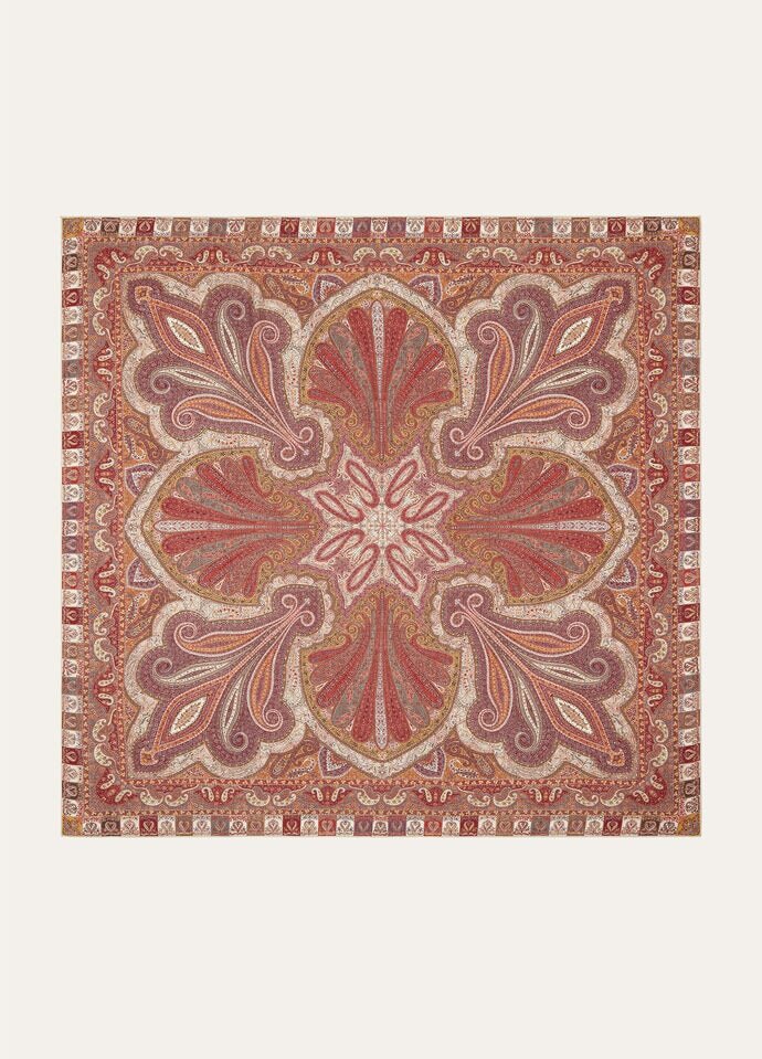 The Sherazade shawl reflects Loro Piana’s rich heritage, beautifully complementing any ensemble with understated finesse. Crafted from an elegant blend of cashmere and silk, this scarf drapes luxuriously over the shoulders; the classic paisley motif is enhanced by the textured hand of the cashmere, creating a three-dimensional effect. The print’s multiple colors are masterfully combined to create a harmonious blend, making this scarf a versatile accessory.