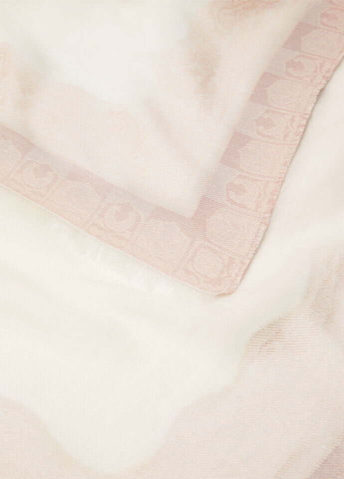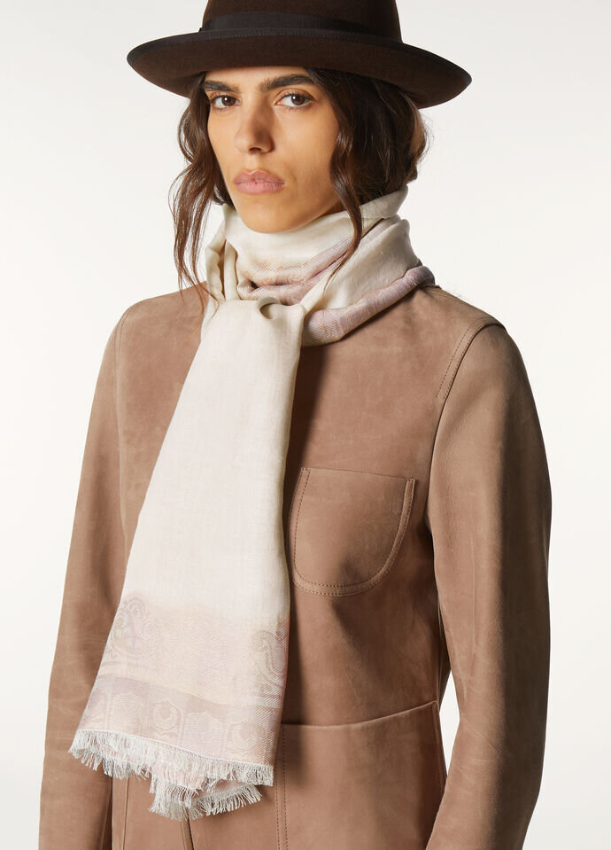 An exquisite finish to summer ensembles, the Sherazade stole is an ode to meticulous craftsmanship, jacquard-woven from a precious blend of silk and linen with a fil coupé finish. Its luminous border encircles the center panel of gossamer-light linen gauze, creating subtle nuances in texture and color.
