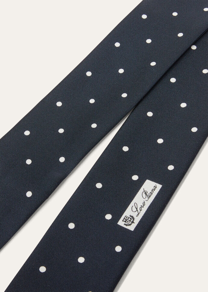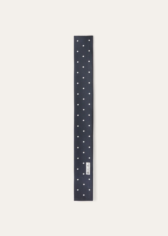 Showcasing beautifully intricate prints, our collection transforms traditional garments into impeccable pieces that celebrate the nuances of time, mastery and thoughtfulness. This tie band features a charming spot print, a design that held a special place in the heart of Sergio Loro Piana. Tie it around your neck or wrist for a chic spirited finish.
