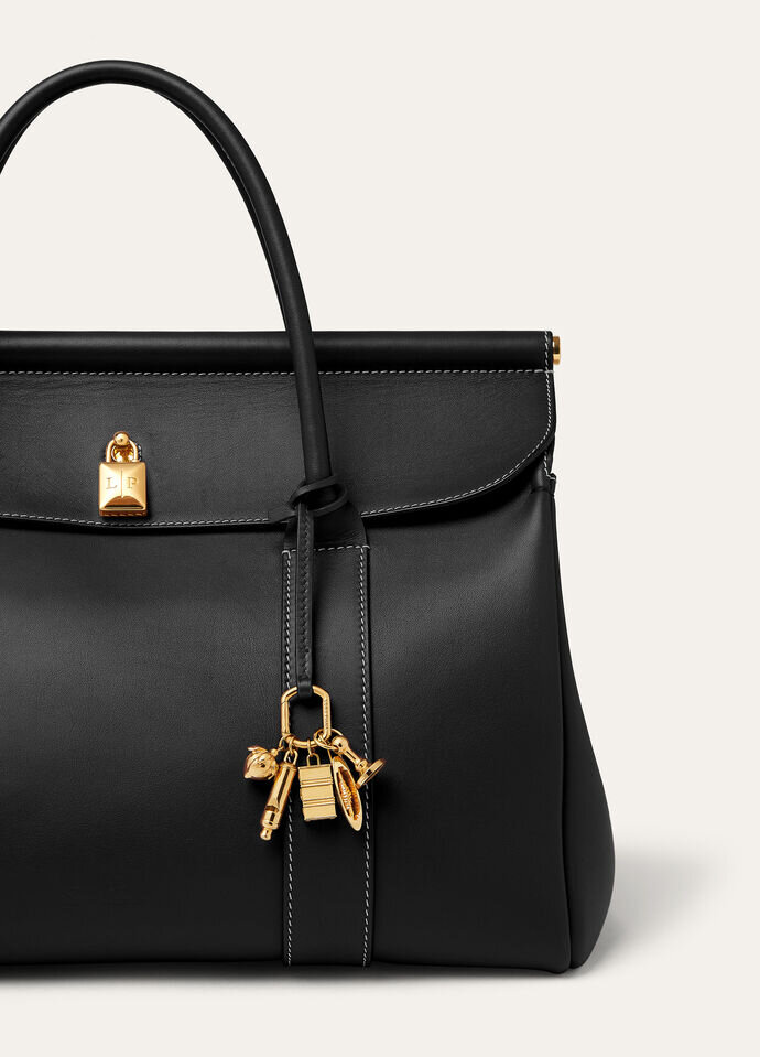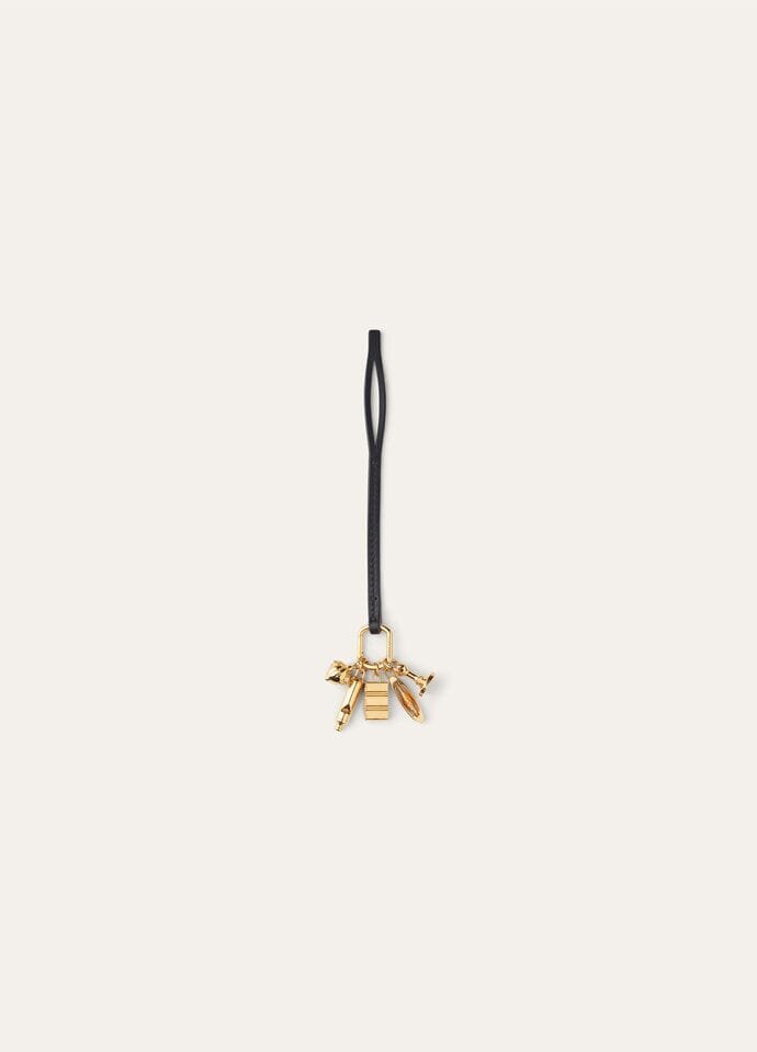 The Anniversary bag charm, a tribute to Loro Piana’s anniversary made of five charms, each celebrating core symbols of the brand: ​the linen flower bud, the suitcase stripe,​ the bobbin, the stamp featuring the brand’s crest, and a playful element is added with a whistle charm.​ Held together by a ring and attachable to bags via a leather lanyard, these charms are a playful yet sophisticated way to personalize one’s accessory.