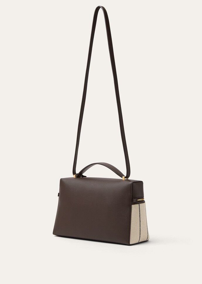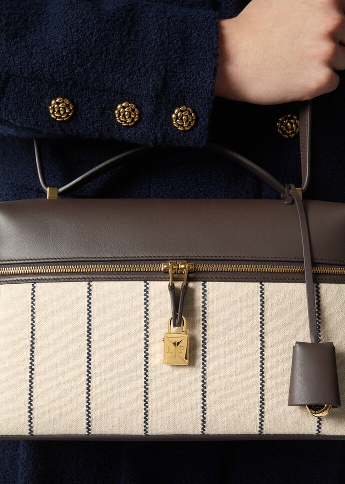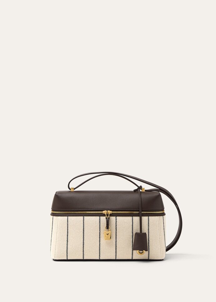 An elegant accessory with compact proportions, the Extra Bag L27 combines timeless style with functionality. Primed for special occasions and everyday elegance alike, it is rendered in cotton-blend fabric with a distinct vintage look and is paneled in leather across the top. Suspended from the double-zip closure are Loro Piana’s iconic charms, framed by a refined leather key holder.