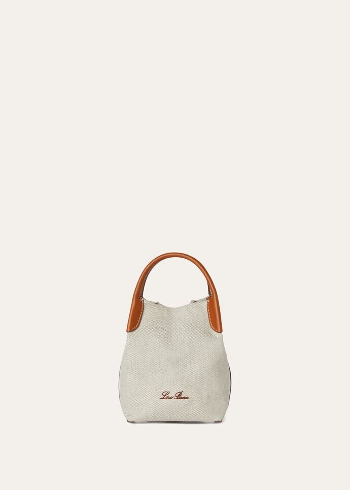 Size: Micro 13 x 13 x 16 cm (5.2″ x 5.2″ x 6.3″) Handle Length: 8 cm Strap Length: 57 cm. A detachable, cotton-and-leather shoulder strap wraps around the entire bag like a ringThe shoulder strap features two holes, so its length can be adjusted, allowing the bag to be carried by hand, over the shoulder or as a crossbody styleBejeweled metal inside closure with Antique Silver finish Removable, matching-leather inside pouchContrasting-colored, embossed Loro Piana logo on the front Outside base lined in leather Composition: 58% Cotton, 42% Linen