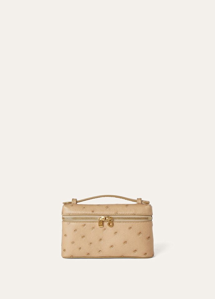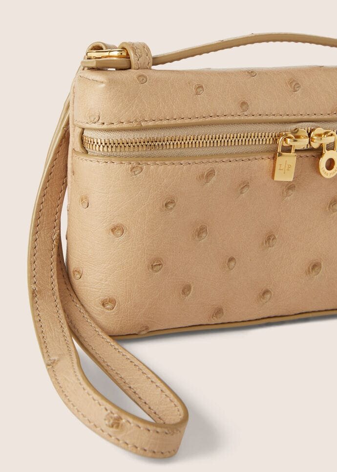 Inspired by the iconic shape of the Extra Pocket, this contemporary mini pouch with zip is crafted in prized ostrich leather for everyday storage that’s both luxurious and practical. Its interior cardholder holds cards securely with added protection. Finished with a removable wrist strap, Loro Piana’s renowned craftsmanship ensures that the fine leather will only improve with time.