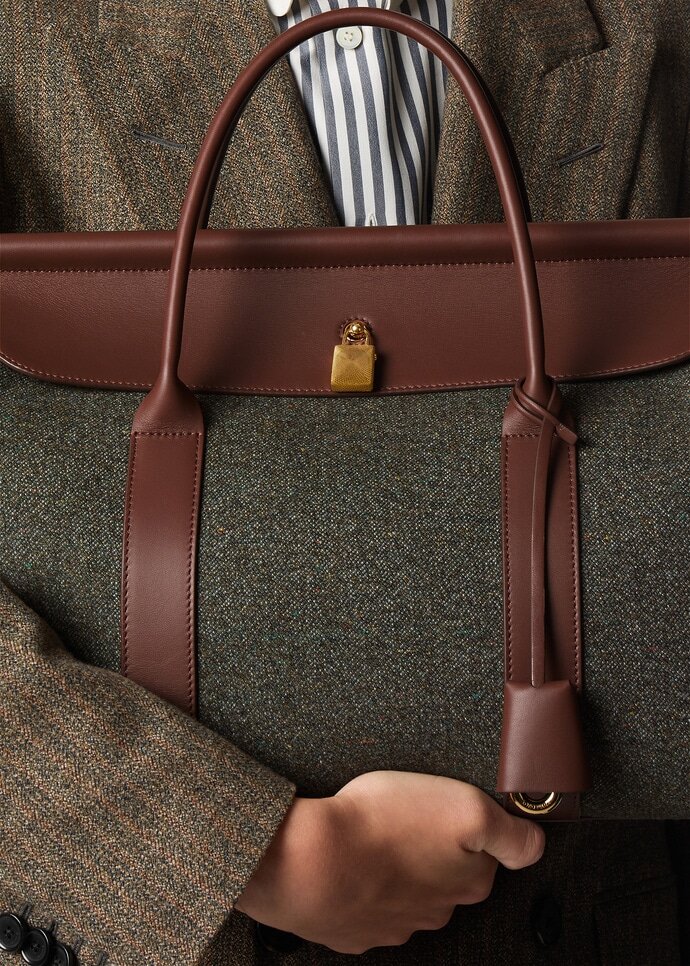 The Loom Bag L32 pays homage to Loro Piana’s century-spanning heritage in fabrics and fibers – the metal bar beneath the flap evoking the gentle cascade of cloth draped across the textile loom. Crafted in tactile Wish Cash Tweed, it is anchored with a refined padlock that can be worn closed, or open for a more relaxed look, that retains its signature charm. The timeless accessory is ideal for carrying in the hand.