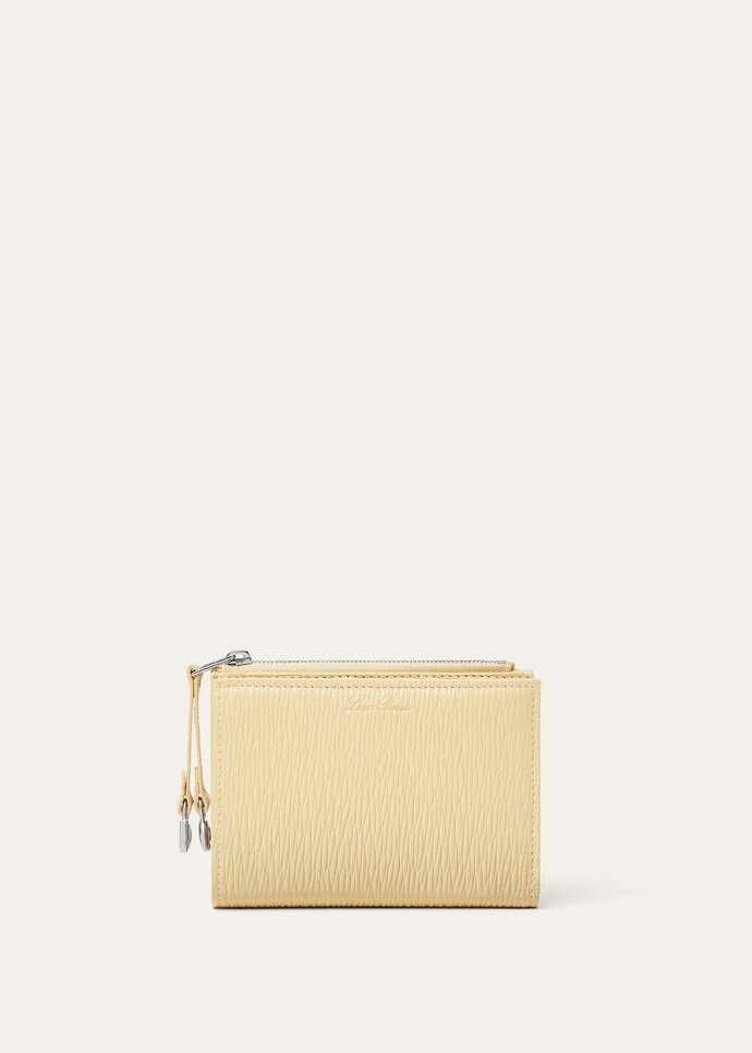 This small wallet exudes refined sophistication with a zip fastening accented by metal logo pendants and a banknote compartment secured by a central button fastening. Crafted from fine calfskin with a sophisticated vertical print. A beautiful, desirable piece that adds a note of refinement.