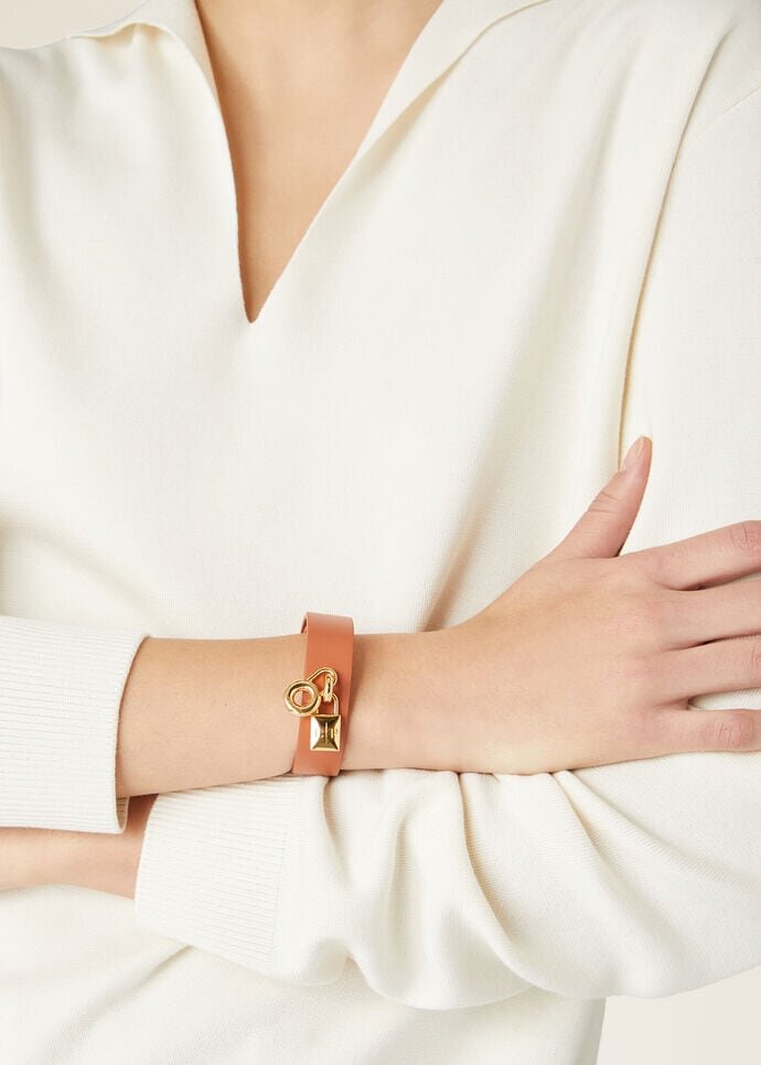 Sublime calfskin contrasts with brass in this bracelet, adorned with rounded charms inspired by Loro Piana’s iconic Extra bag. Slide it onto your wrist for a touch of texture and personal style.