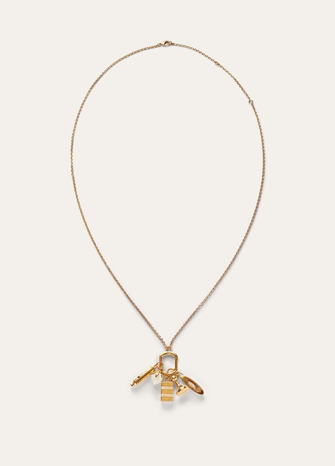 Adorned with the Maison’s Anniversary Charms, this delicate necklace pays tribute to Loro Piana’s century-spanning heritage in fabrics and fibers. It’s crafted in brass, with five enameled charms from the Maison’s unique world: the iconic side-striped suitcase, a lotus flower bud, a thistle stamp, a spool, and a whistle.