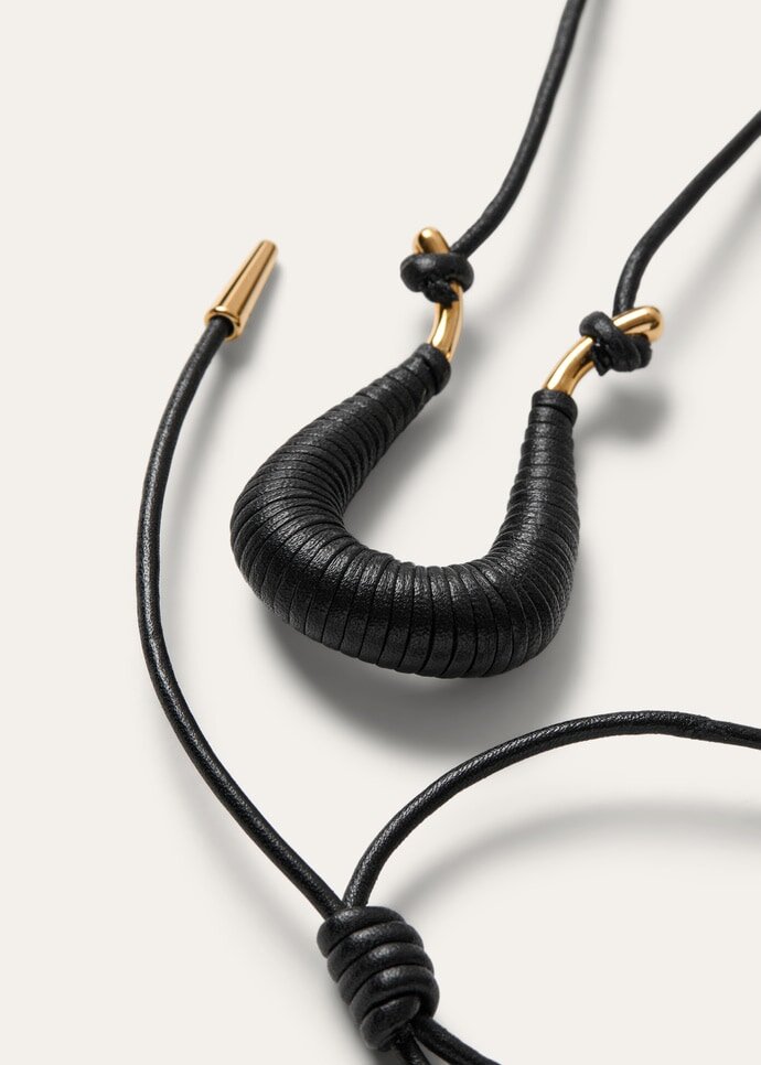 The Duo necklace makes for a sophisticated finishing touch to the Loro Piana silhouette. Suspended from it is a defining pendant in light-reflecting Sun Gold brass, which is meticulously wrapped with strips of leather until fully covered. Complete with a slender leather cord, it coordinates perfectly with the earrings from the line.