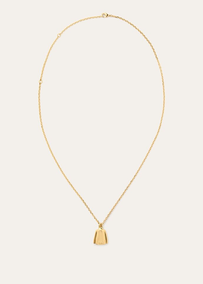 The Spagna Jacket necklace reimagines an icon of Loro Piana tailoring as a finely sculpted pendant, offering a miniature tribute to the Maison’s legacy in fabrics and fibers. Cast in brass with a Sun Gold finish, it captures the soft structure and effortless elegance of the original garment. A delicate lobster clasp secures the design with considered polish.