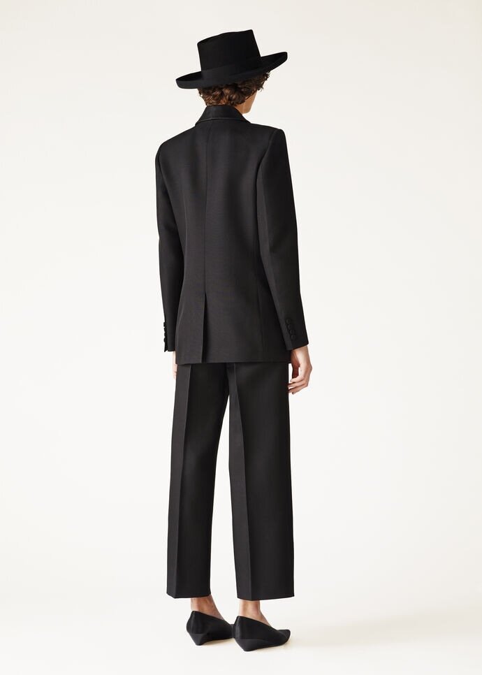 Blending masculine edge with feminine grace, the Doreen jacket redefines evening allure. This double-breasted tuxedo jacket in silk and wool is distinguished by its clean lines and luxurious texture. The shawl collar, doubled with silk duchesse, adds a finishing touch of luminosity.