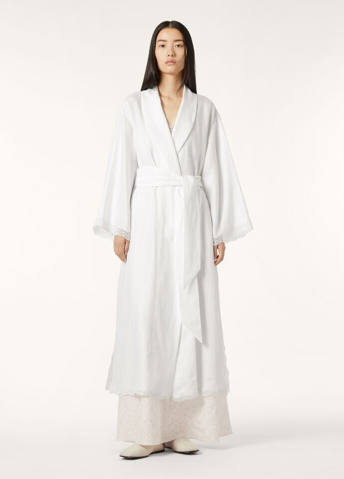 In a pure white hue with a feminine same-fabric belt to cinch the shape, the Braxton robe from the Lingerie Capsule embodies the elegance of vintage-style dressing gowns. It is crafted from Twill Summer, a luxurious linen weave that is treated with aloe vera for softness and fluidity and lends itself perfectly to the elegant shawl-collared silhouette. A closer look reveals silk Guipure lace details decorating the cuffs, hem, and side slits, adding a touch of artistry.