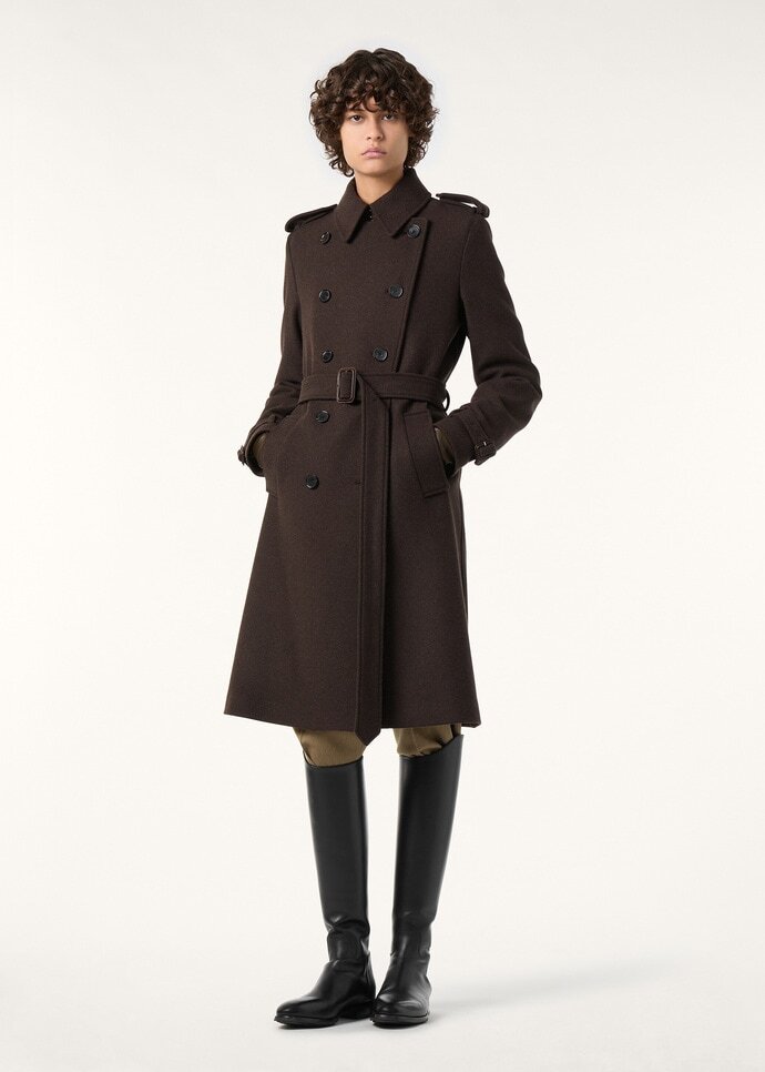 A modern yet timeless essential from the Loro Highlands Capsule collection, the Kerril trench coat is elevated with an unmistakable Loro Piana touch. In a bespoke blend of wool with a touch of cashmere, it has a sleek finish and nuanced texture. Notched lapels, a storm flap, and a buckled belt add to its classic character.