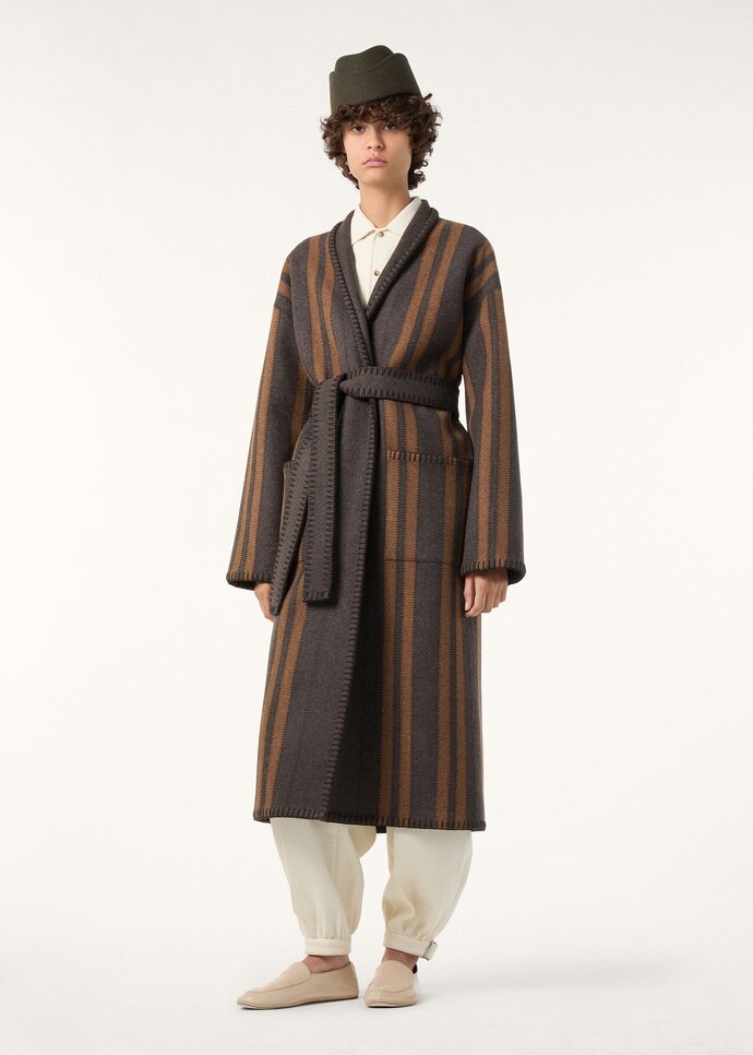 Completely unlined, the Kirk coat is modeled after classic bathrobes for innate comfort. It is made using a special inlay technique whereby strips of cashmere are joined by hand with contrasting cover stitching. The arrangement of the strips – vertical on the body and slanted on the sleeves – creates a distinctive composition of lines and color, lending textural and visual richness. A same-fabric tie belt cinches the flowing design.